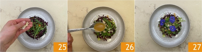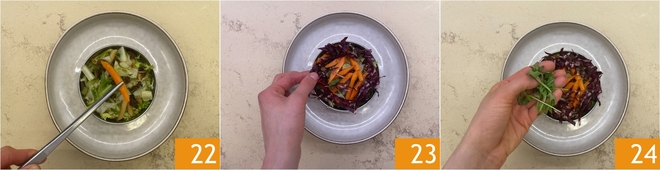 Ga verder met de gebakken witlofstelen, de gebakken wortels 22, de rode mizuna, de radicchio en de rucola. 23