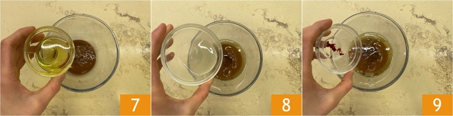 Ga nu verder met de saus: doe in een kom de umeboshi-puree, de geroosterde sesamolie 7, de agavesiroop, het citroensap 8 en de fijngehakte verse chilipeper 9.