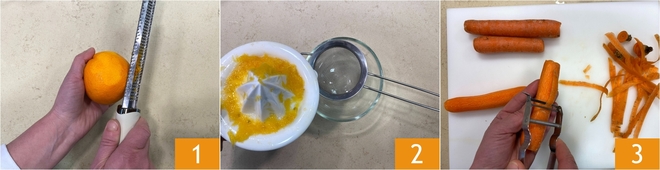 Om de worteltaart te bereiden: rasp eerst de schil van de sinaasappel 1 en zet apart. Pers het sap uit en zeef het 2. Snijd nu de uiteinden van de wortels en schil ze 3.