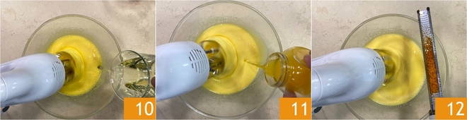 Wanneer de eieren goed opgeklopt zijn, voeg je langzaam de plantaardige olie 10 en het sinaasappelsap toe 11. Voeg dan ook de geraspte sinaasappelschil toe 12.