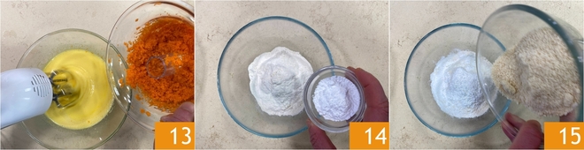 Blijf mixen en voeg ook de wortels toe 13. Mix tot alles goed is opgenomen. Doe nu de bloem, gezeefde bakpoeder 14 en amandelmeel 15 in een kom. Meng de droge ingrediënten met een lepel.