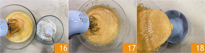 Zet de mixer opnieuw aan en voeg de droge ingrediënten beetje bij beetje toe 16. Mix op gemiddelde snelheid tot je een homogeen mengsel hebt 17. Giet het dan in een met bakpapier beklede vorm van 22 cm 18.