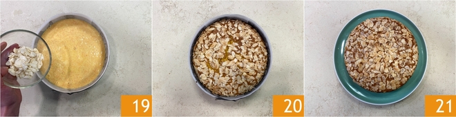 Decoreer de bovenkant met amandelschilfers 19 en bak in een voorverwarmde statische oven op 180°C gedurende 55 minuten. Doe altijd de prikkertoets voordat je het eruit haalt 20. Laat volledig afkoelen, vervolgens losmaken en decoreren met poedersuiker. Je worteltaart is klaar om geserveerd te worden 21!
