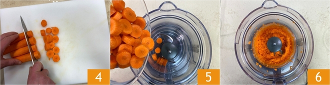 Snijd de wortels in plakjes 4 en doe ze in een mixer met messen 5. Hak vervolgens de wortels fijn 6.