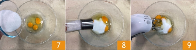 Breek de eieren in een kom, voeg de suiker toe 7 en een snufje zout 8. Mix met een elektrische mixer 9 tot een lichte en schuimige consistentie 9.