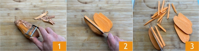 Om de gefrituurde zoete aardappels te bereiden, schil je eerst de zoete aardappels 1. Snijd ze in plakken van 1 cm dik 2 en snijd die plakken vervolgens in dunne reepjes 3, zodat je stokjes van circa 1 cm krijgt.