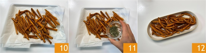 Bak de frietjes op deze manier verder 10 en bestrooi ze aan het einde met het aromatische mengsel 11, meng even en serveer de frietjes meteen warm 12.