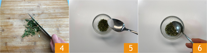 Verwarm ondertussen de olie tot 170 °C en terwijl die op temperatuur komt, hak je de knoflook zonder kiem fijn samen met de rozemarijn en tijm, beide van de takjes geplukt 4. Doe dit in een kom en voeg het zout toe 5. Meng goed 6 en zet apart.