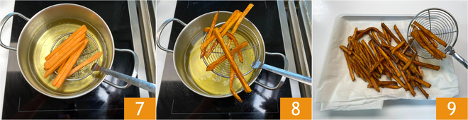 Dompel telkens een paar zoete aardappels tegelijk onder, met behulp van een schuimspaan 7. Wacht ongeveer 5 minuten en wanneer ze goudbruin zijn haal je ze uit de olie 8 en leg je ze op een schaal bedekt met keukenpapier om overtollige olie te verwijderen 9.