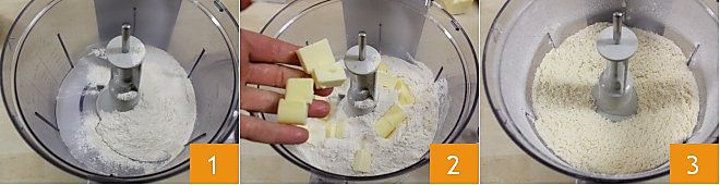 Om de zoete taralli uit Campanië te maken, doe je eerst de bloem 1 in een mixer samen met de goed koude boter, in stukjes gesneden 2, en maal je de ingrediënten tot een zandachtige massa 3. Als je geen mixer hebt, werk je de bloem en de boter met de hand tot je een kruimelig mengsel krijgt.