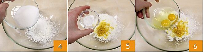 In een kom meng je de overige ingrediënten: maïszetmeel (als alternatief kun je aardappelzetmeel gebruiken) en de suiker 4, daarna voeg je de geraspte schil van een citroen (of van een sinaasappel, naar smaak) toe, het bakpoeder 5 en tenslotte de twee eieren 6.
