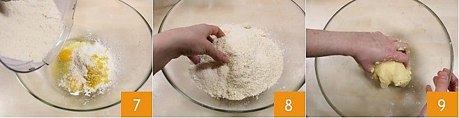 Voeg het zandachtige mengsel van boter en bloem 7 toe en begin met de handen te kneden 8 zodat alle ingrediënten één samenhangend deeg vormen 9.