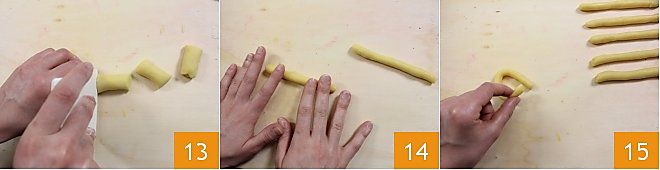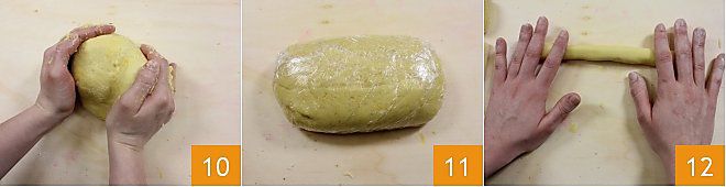 Leg het deeg op een werkvlak en kneed het met de handen tot je een glad en compact bolletje krijgt 10; wikkel het bolletje in vershoudfolie 11 en zet het ongeveer 30 minuten in de koelkast (koud deeg is makkelijker te bewerken). Haal het deeg na die tijd uit de koelkast en verdeel het in grotere stukken om er rolletjes van te vormen 12,