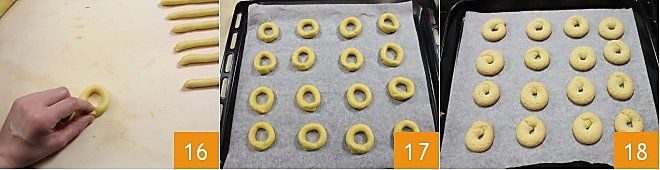 Leg de uiteinden op elkaar en druk licht aan om de taralli te sluiten en te verzegelen 16. Ga zo door totdat al het deeg op is en leg de gemaakte taralli op een bakplaat bekleed met bakpapier, goed uit elkaar 17. Bak in een voorverwarmde oven op boven- en onderwarmte op 180°C gedurende 17-20 minuten (bij hetelucht 160°C gedurende 12-15 minuten), tot ze goudbruin zijn. Haal de zoete taralli uit Campanië uit de oven 18, laat ze afkoelen op een rooster en eet smakelijk!