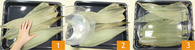 Om zongzi te maken, leg je eerst de bamboebladeren in een ruime schaal 1, bedek je ze met water 2 en leg je er een gewicht op zodat ze ondergedompeld blijven 3. Laat ze 12 uur weken.