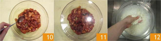 Meng goed 10, dek af met vershoudfolie 11 en laat 2 uur marineren. Spoel ondertussen de rijst onder stromend water 2-3 keer 12.