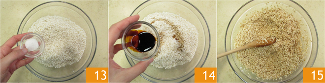 Doe de rijst in een kom en breng op smaak met zout 13 en donkere en lichte sojasaus 14. Meng goed en zet opzij 15.