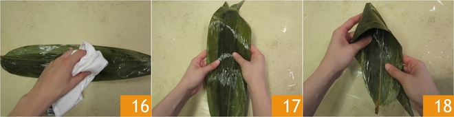 Na het weken neem je de bamboebladeren terug, spoel je ze onder stromend water en maak je ze aan beide zijden schoon met een doek om onzuiverheden te verwijderen 16. Leg twee bladeren licht overlappend op elkaar 17, vouw ze vervolgens zodat je een soort kegel krijgt die aan één kant open is 18.