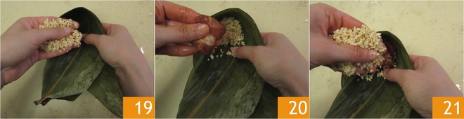 Houd de gevormde kegel in de palm van je hand en doe er een kleine handvol rijst in 19, voeg dan 2 of 3 stukjes vlees toe 20 en dek af met meer rijst 21; de rijst aan de onderkant moet ongeveer een derde van de totale vulling van elke zongzi zijn.