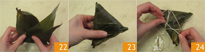 Vouw de randen van de bladeren terug 22 zodat je een driehoekige vorm krijgt 23 en sluit door het pakketje met meerdere slagen keukentouw vast te wikkelen 24. Ga op dezelfde manier verder totdat de ingrediënten op zijn; met deze hoeveelheden krijg je 20 stuks. Voor het gemak kun je de uiteinden van het touw van 4-5 zongzi aan elkaar knopen zodat ze gemakkelijker uit de pan te halen en te laten uitlekken zijn.