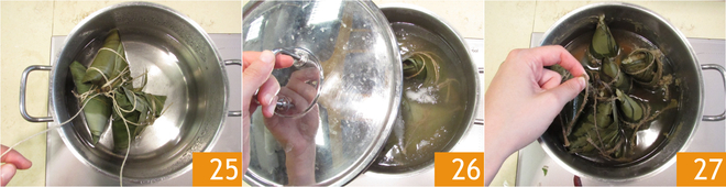 Dompel de zongzi onder in een ruime pan gevuld met ruim water 25, dek af met het deksel en breng op hoog vuur aan de kook. Wanneer het water begint te koken, draai je het vuur laag en laat je nog 2 uur zachtjes koken 26. Nadat de kooktijd voorbij is, haal je de zongzi uit het water 27.