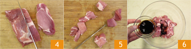 Snijd het vlees in plakken van ongeveer 2 cm dik 4 en snijd deze in stukjes 5. Doe ze in een kom en maak op smaak met lichte en donkere sojasaus 6.