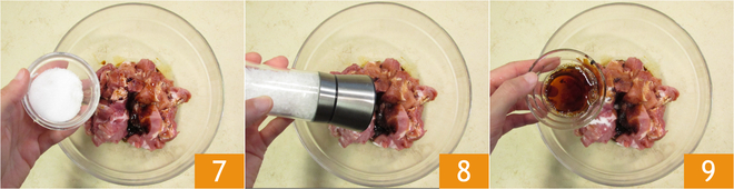 Voeg ook de suiker 7, het zout 8, de peper en de rijstwijn toe 9.