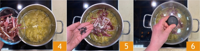 Als de vleesbouillon aan de kook is, voeg je ook de gerookte pancetta toe 4, breng op smaak met jeneverbessen 5 en dek af met het deksel 6. Zet het vuur laag en laat 40 minuten met het deksel op de pan sudderen, haal het deksel er dan af en laat nog eens 15 minuten verder koken.